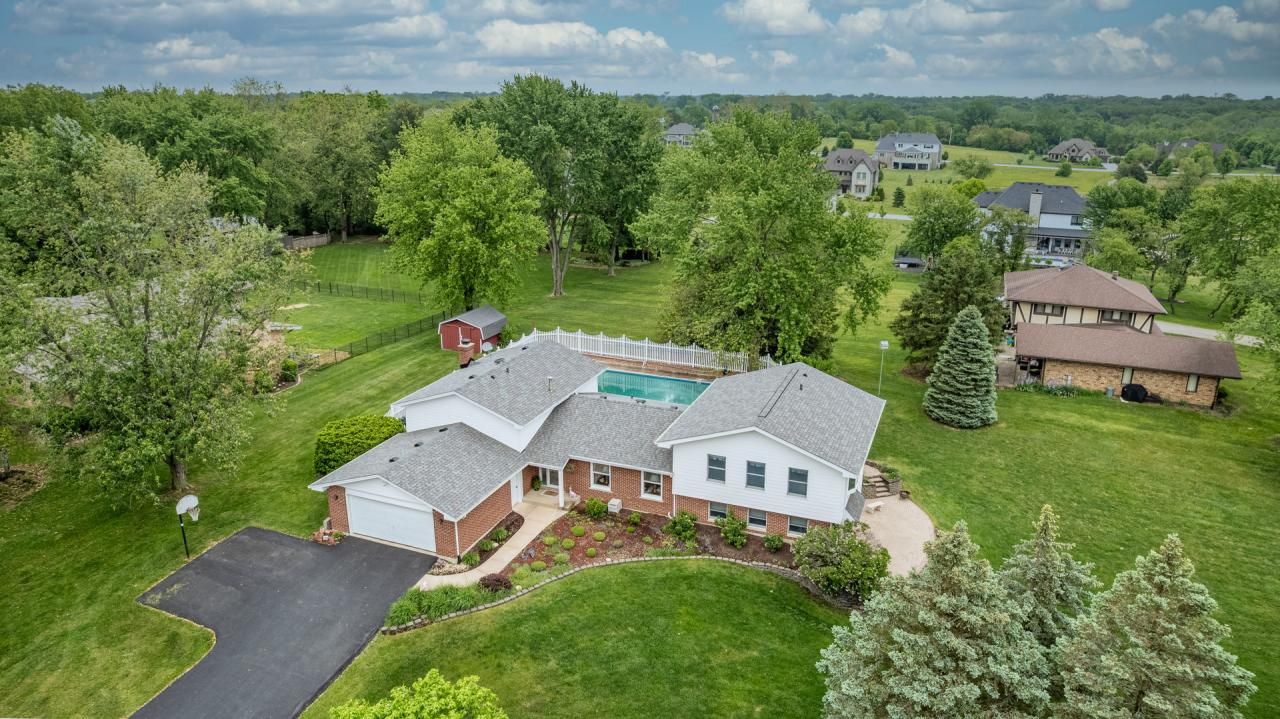 Welcome to this rarely available property situated on a sprawling corner lot with stunning views from every direction. This spacious and beautifully cared for property sits on nearly a full acre of professionally landscaped land and boasts a stunning addition, perfect for related living or expanded entertaining.Recent updates provide peace of mind which includes a New tear-off roof (2024), Hardy Board siding, and gutters (2024), Central A/C and furnace with humidifier (2022). Step inside to find a bright and inviting main level featuring a spacious living room, a charming formal dining room with a bay window, and a remodeled eat-in kitchen. The kitchen is a chef's delight with solid oak cabinetry, elegant Caesarstone countertops, a breakfast bar, and a sliding glass door leading to the backyard. On the lower level of the original home, you'll enjoy a cozy family room with a gas/wood-burning fireplace, a large laundry room with a new utility sink, newer well pressure tank (2019), plus a convenient full bathroom with a shower. Upstairs, there are three well-sized bedrooms and a full hall bath which completes the original part of the home. The newly built addition adds tremendous space and flexibility, offering a second family room with great space for family and guest along with a French door leading to a brick paver patio. There is also a 5th bedroom or private home office-perfect for guests or remote work. The 2nd floor primary suite is a true retreat featuring vaulted ceilings, picturesque bay windows, a large walk-in closet, and a luxurious en-suite bathroom with double sinks and a soaking tub. Additional features include an attached 2-car garage with pull-down attic access and shelving. The oversized backyard oasis with a vinyl privacy fence around the 20x40 heated in-ground pool with a diving board (3-9 ft depth), and a large concrete patio ideal for outdoor entertaining. A nice storage shed adds even more space for lawn equipment. Don't miss this rare opportunity to own a spacious, move-in-ready home on a generous lot with a blend of modern upgrades, charm, and outdoor luxury. Schedule your private showing today!